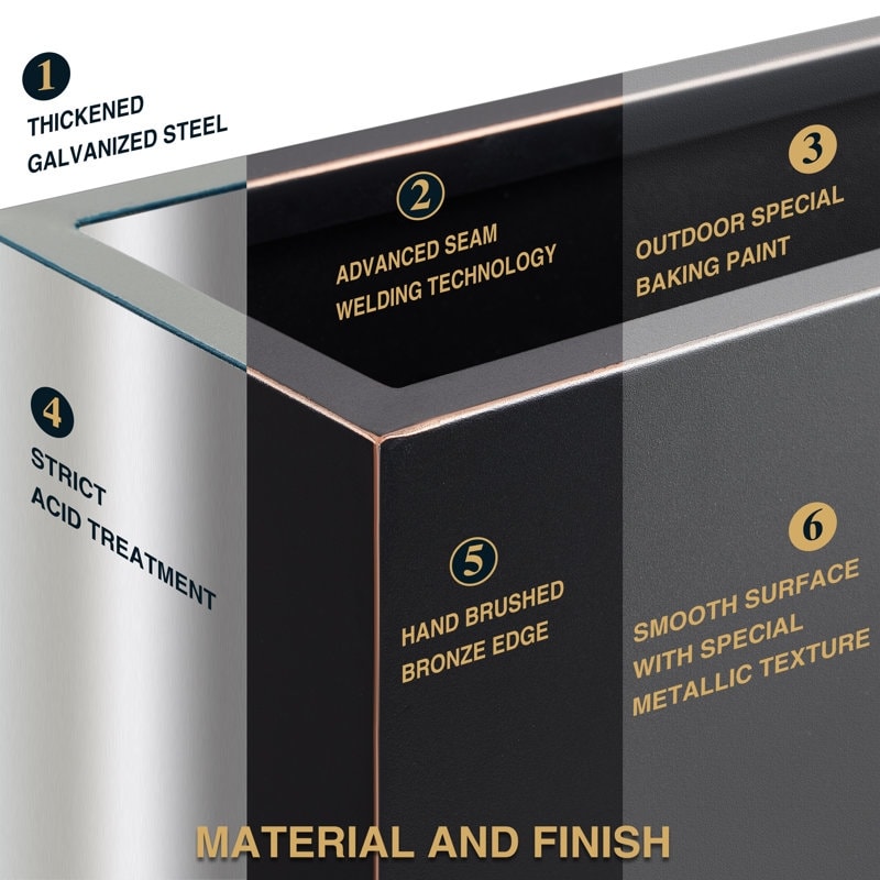Whether it’s your room, your patio, or the lackluster entrance wall of your home, this metallic series indoor/outdoor box planter—with its perfect balance of design, durability, and convenience—features a low modern design that is the perfect fit for elevating your outdoor decor or residential and commercial settings to a whole new level. It is crafted from full seam welded, thick gauge powder-coated galvanized steel with a furniture-quality finish, which gives the planter its flexible, impact, crack, and scratch-resistant qualities. To top it off, it is equipped with an optional drainage hole to drive out excess water easily.